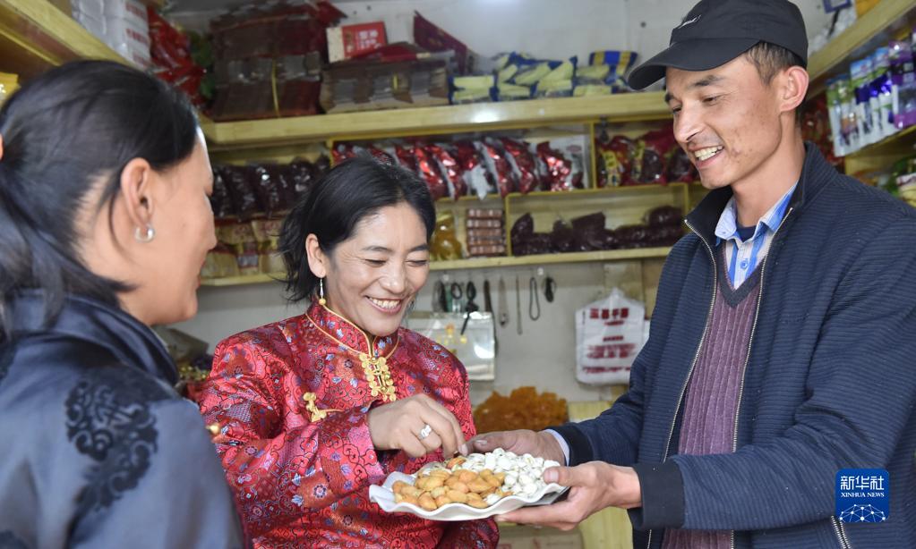 阿卜杜杰力力·麥提如剛(右)于2010年從新疆和田墨玉縣來(lái)到西藏阿里獅泉河鎮(zhèn)做干果生意,并融入到獅泉河鎮(zhèn)藏布居委會(huì)的民族大家庭中。圖為阿卜杜杰力力·麥提如剛請(qǐng)當(dāng)?shù)夭刈迮笥哑穱L來(lái)自家鄉(xiāng)的特產(chǎn)(9月22日攝)。新華社發(fā)(索朗羅布 攝)