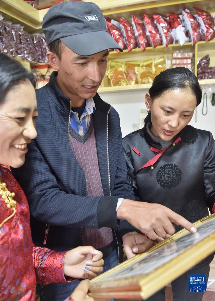 從新疆和田墨玉縣來(lái)到西藏阿里獅泉河鎮(zhèn)的阿卜杜杰力力·麥提如剛(中)給鄰居們看自己的家庭合影(9月22日攝)。新華社發(fā)(索朗羅布 攝)