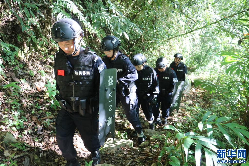 走在隊伍最前面的是教導(dǎo)員李永杰,他手拿一把砍刀,一邊清理小路兩側(cè)蔓延出來的枝丫,一邊時刻關(guān)注身后其他人員的情況。隨著海拔升高,陽光從郁郁蔥蔥的樹葉間撒下縷縷光芒,2名女民警艱難穿行期間,謹慎觀察著周圍情況后前行。