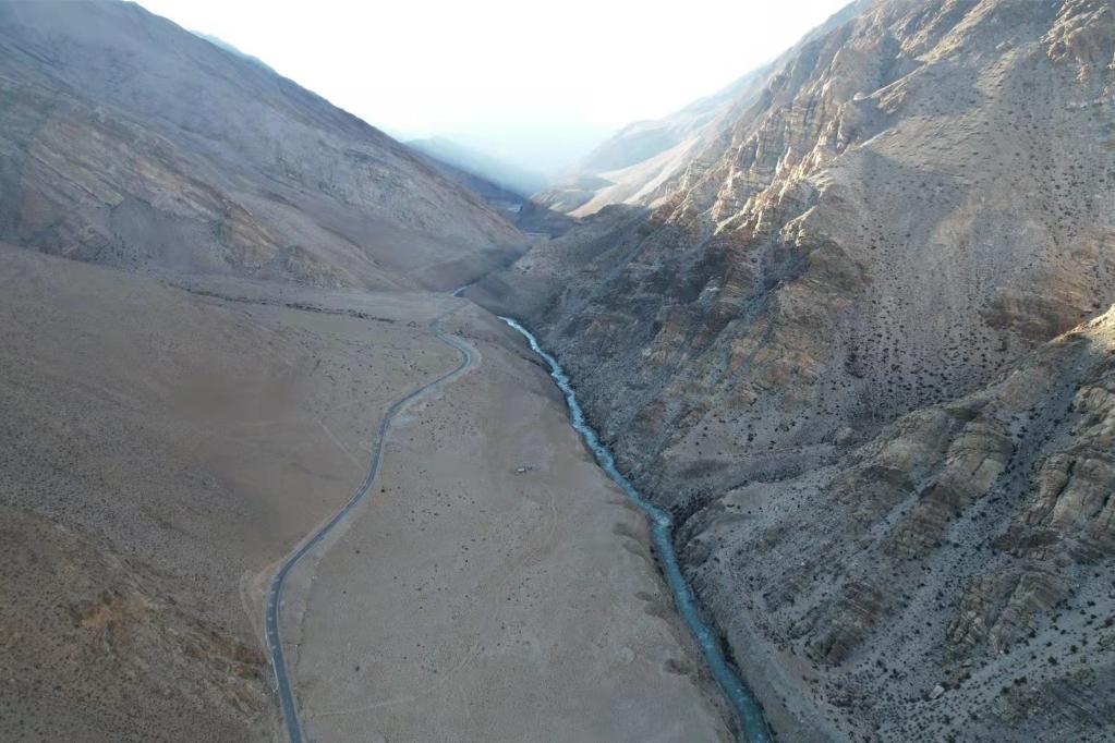 離開參木達村,沿扎嘎曲逆流而上行駛約20分鐘后,公路旁的扎嘎曲開始在峽谷中東西向蜿蜒而行,進入整條河流的最狹窄處。記者在S516省道29公里處停車航拍,只見公路與河流像兩條平行的曲線,時遠時近,向遠方延伸。