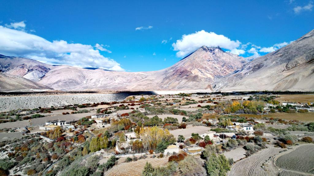 十月下旬,記者驅(qū)車來到曲當鄉(xiāng)參木達村。透過航拍中的無人機遙控器顯示屏,記者看到,藏式民居在秋色浸染的樹木映襯下錯落有致,秋日照耀下色彩斑斕,村東有巍峨的雪山、村西是奔騰南去的河流。