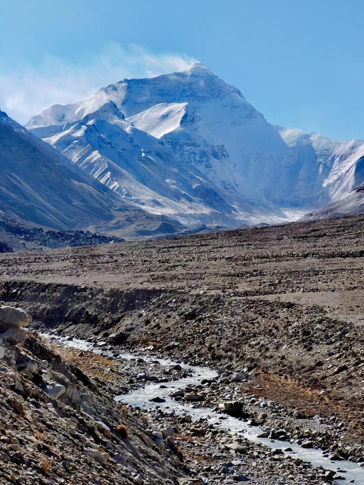 車行約20分鐘后,到達游客大本營。這里是游客在珠穆朗瑪峰國家級自然保護區(qū)內(nèi)可以到達的距離珠峰最近的位置。面向海拔8848.86米的珠峰,發(fā)源于絨布冰川末端的扎嘎曲在游客大本營右邊流過。