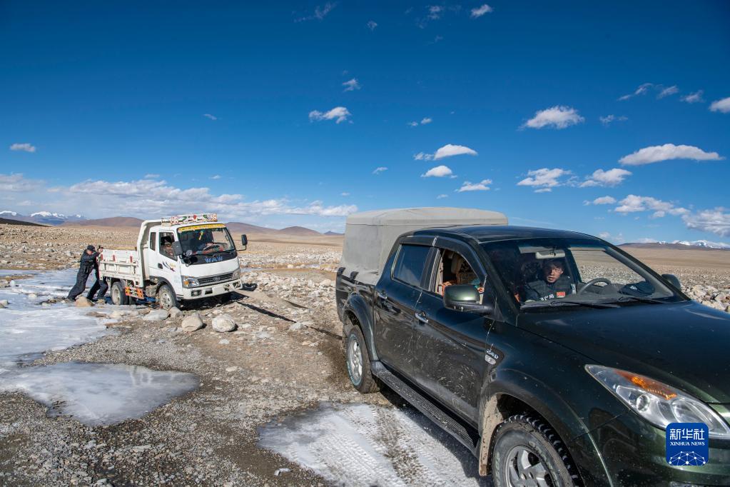 普瑪江塘邊境派出所的移民管理警察在巡邏途中協(xié)助牧民旦增多杰一家拖拽“罷工”的小貨車(chē)(11月20日攝)。新華社記者 孫非 攝