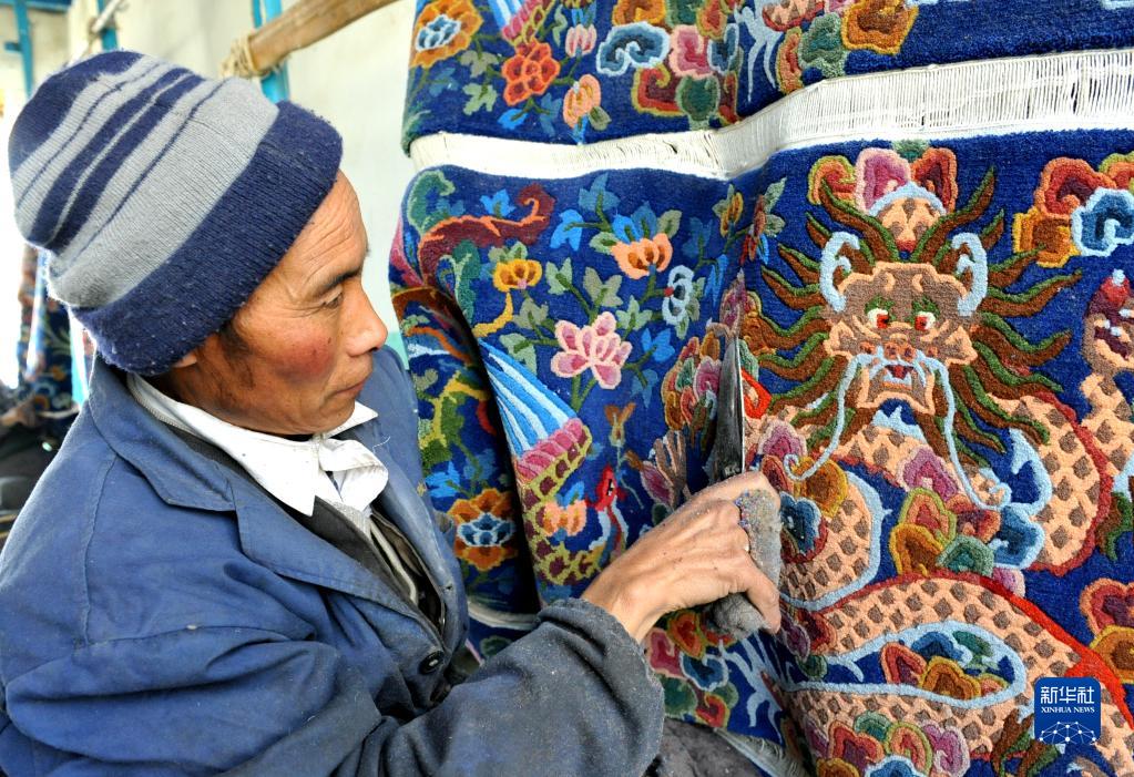江孜昵煒藏毯廠工人正在對(duì)卡墊進(jìn)行修剪。(2021年10月29日)新華社記者洛卓加措 攝