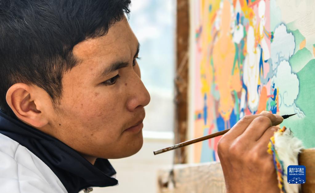 在西藏昌都市卡若區(qū)嘎瑪鄉(xiāng)民族手工藝培訓(xùn)基地,學(xué)員正在學(xué)習(xí)唐卡繪畫。(2019年10月3日攝)新華社記者晉美多吉 攝