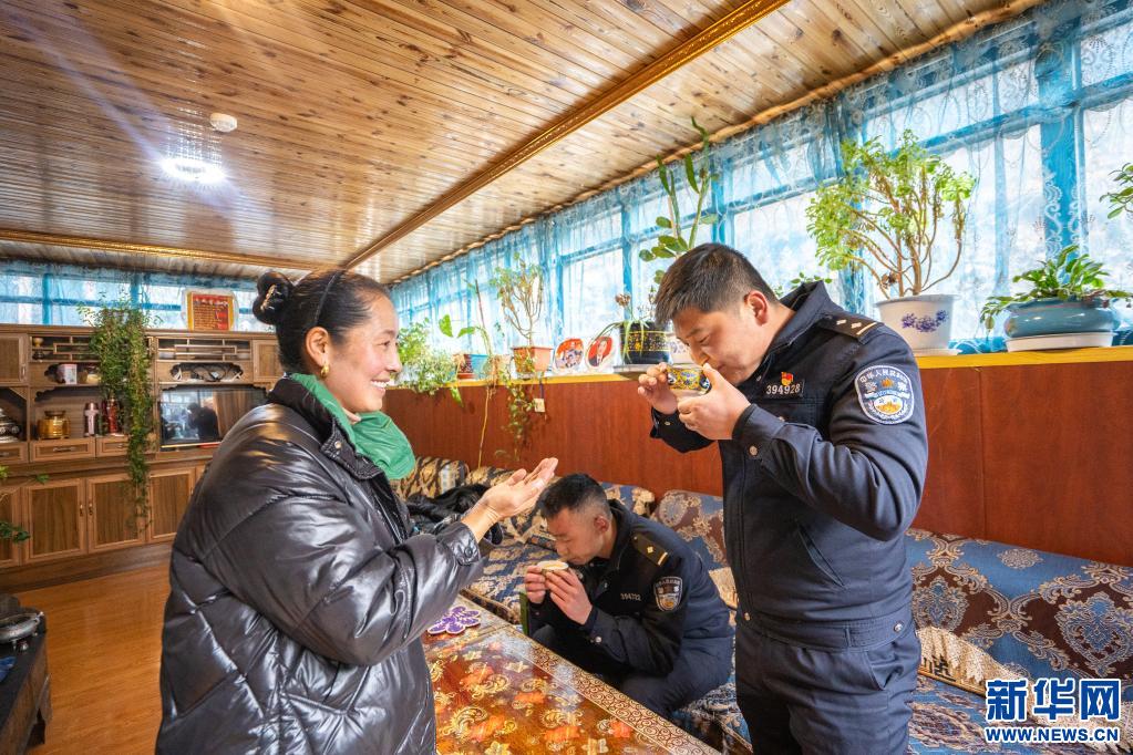 民警幫轄區(qū)群眾劈完柴火后,群眾請(qǐng)民警喝一杯酥油茶(12月7日攝)。新華社發(fā) (晴雯、彭維熙、劉戀報(bào)道)