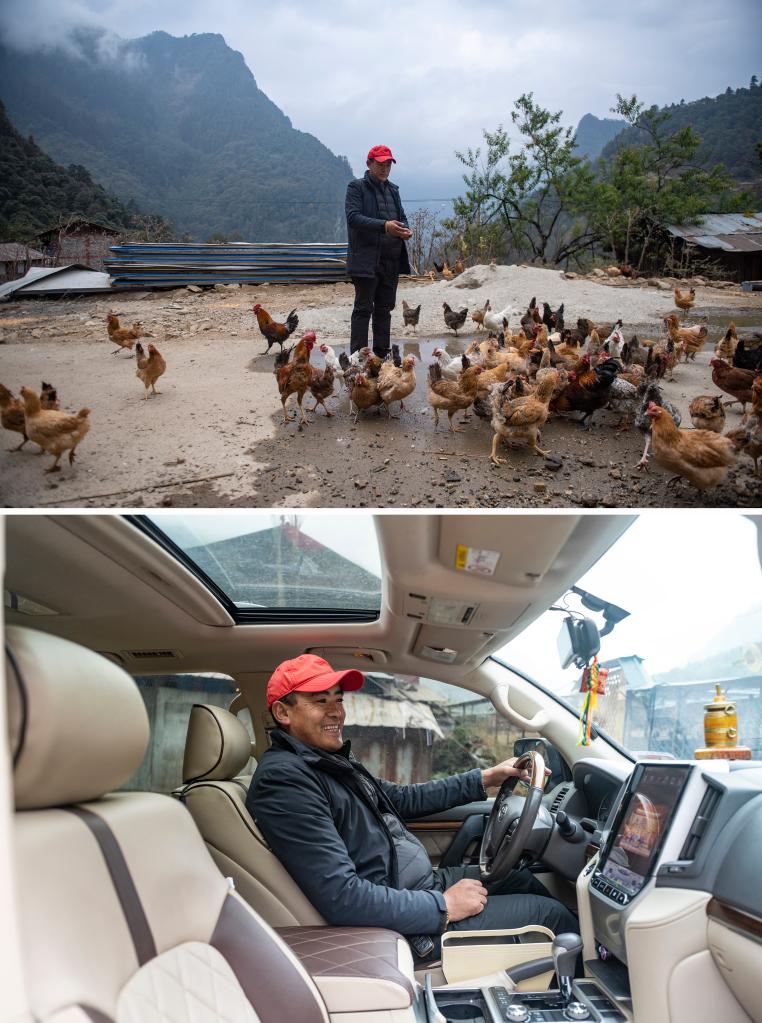 拼版照片:上圖為,陳塘鎮(zhèn)的致富帶頭人拉巴塔杰給養(yǎng)雞場的散養(yǎng)雞喂食;下圖為,拉巴塔杰坐在自己致富后購買的越野車內(均為11月25日攝)。 新華社記者 孫瑞博 攝