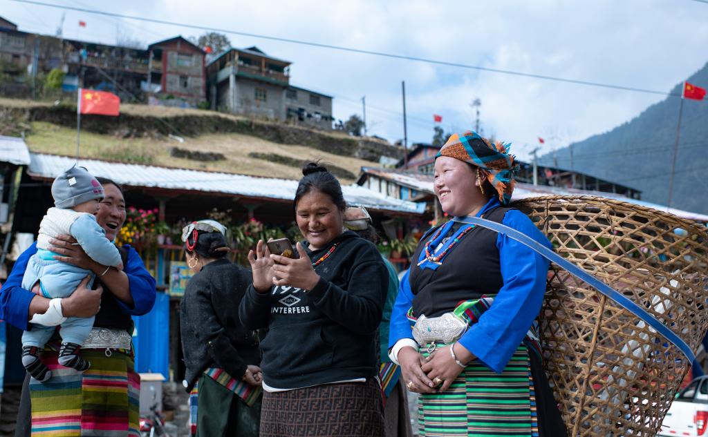 陳塘鎮(zhèn)的夏爾巴婦女在村頭開心聊天(11月24日攝)。 新華社記者 普布扎西 攝