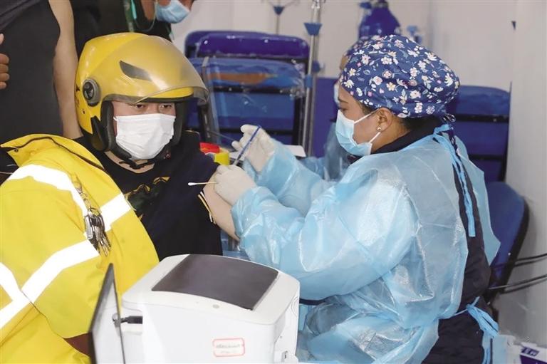 醫(yī)務(wù)人員為美團(tuán)外賣騎手接種第三針新冠疫苗。圖片來自拉薩工會(huì)微信公眾號