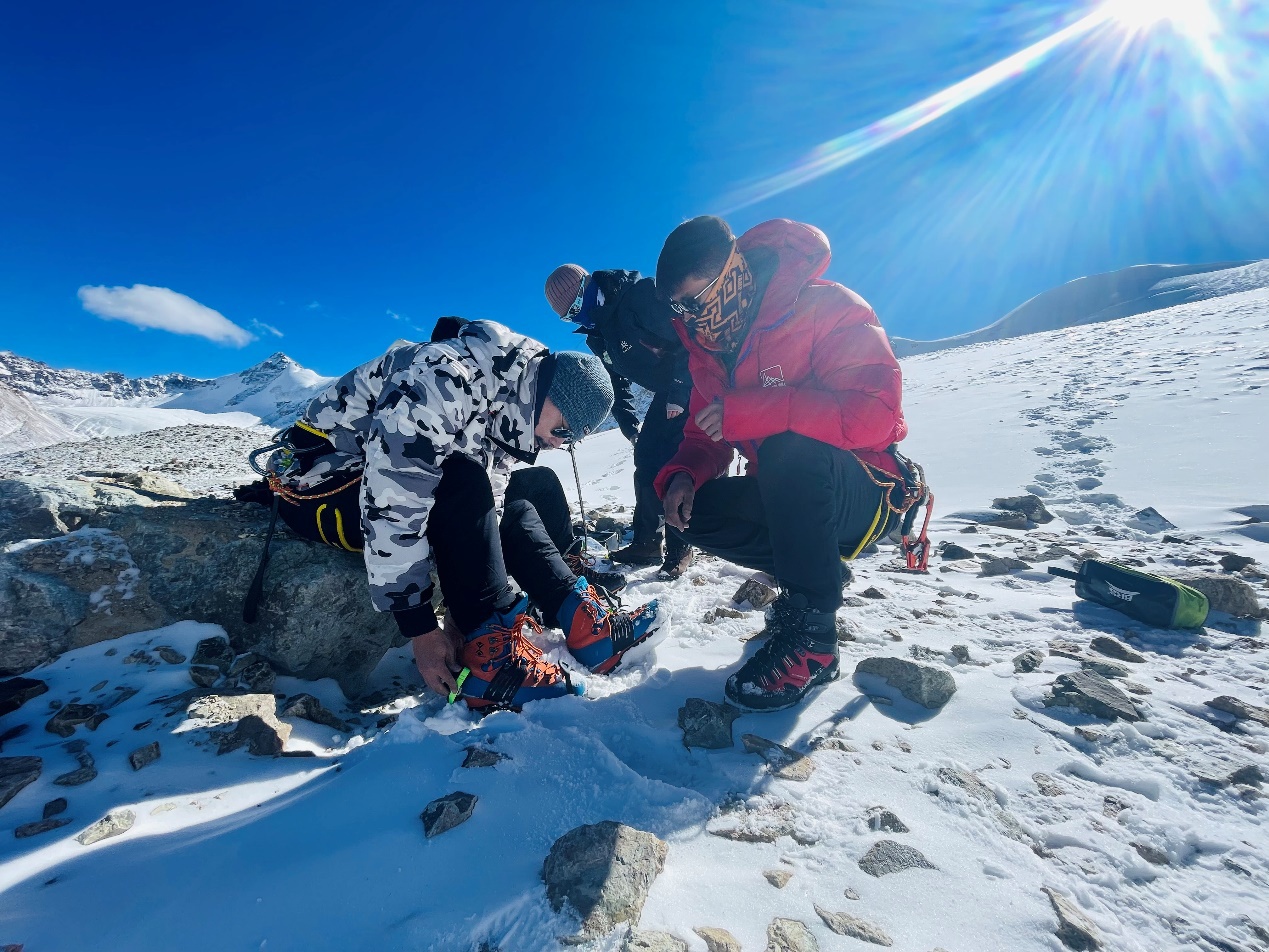 抵達洛堆峰5600米雪線的位置,三位二十歲出頭的年輕人熟練地在積雪冰壁上打起冰錐,固定路繩,他們在給這些遠道而來的體驗者設置技能訓練路線。
