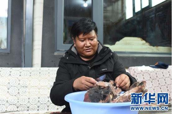 2月27日,在榮瑪鄉(xiāng)高海拔生態(tài)搬遷點村民達娃次仁在清洗羊頭。新華網(wǎng) 旦增努布 攝