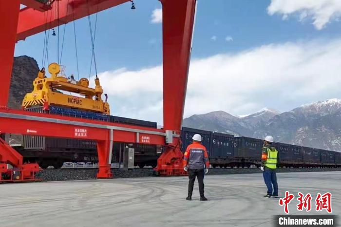西藏林芝車站貨場對集裝箱進行接卸。格桑曲珍 攝
