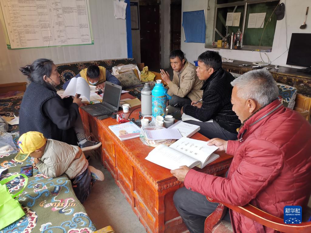 在特布拉村,駐村第一書記吉宗(女,左一)正與其他村干部開會(huì),商討農(nóng)村廁所改造事宜。新華社記者 林建楊 攝(手機(jī)照片,4月16日攝)