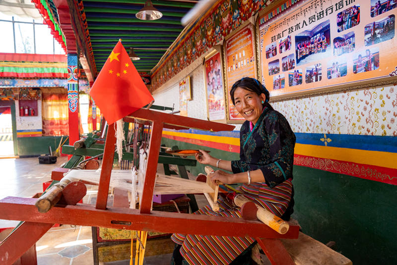 村民在織卡墊。上海援藏聯(lián)絡(luò)組供圖