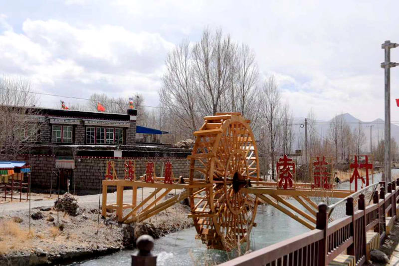 走進(jìn)索蓋村,映入眼簾的就是一架大水車,上面刻著“上海援藏 索蓋村”四個(gè)小字、三個(gè)大字。