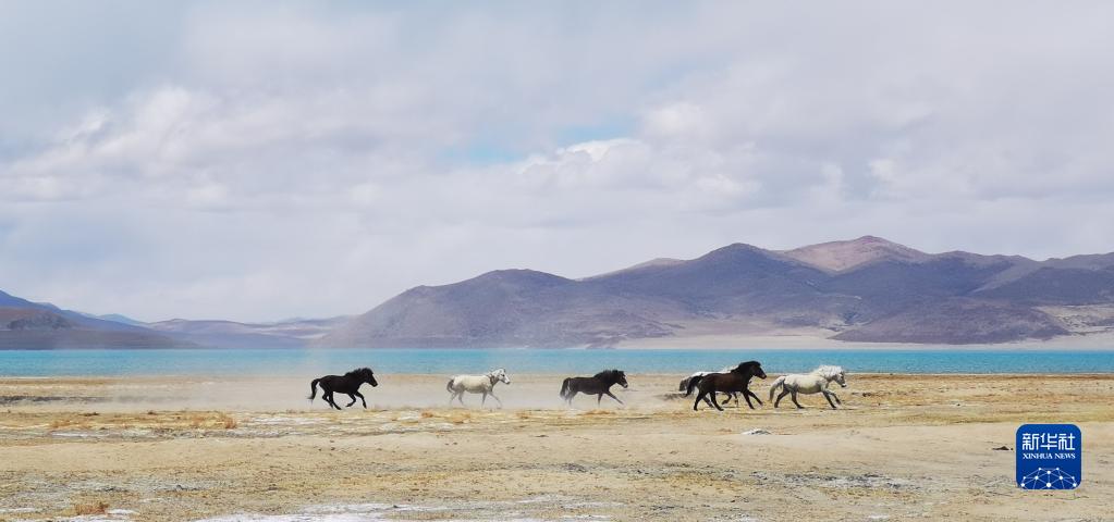 馬群在位于西藏自治區(qū)日喀則市聶拉木縣境內(nèi)的佩枯錯(cuò)旁奔跑(2021年5月14日攝,手機(jī)照片)。新華社記者 沈虹冰 攝