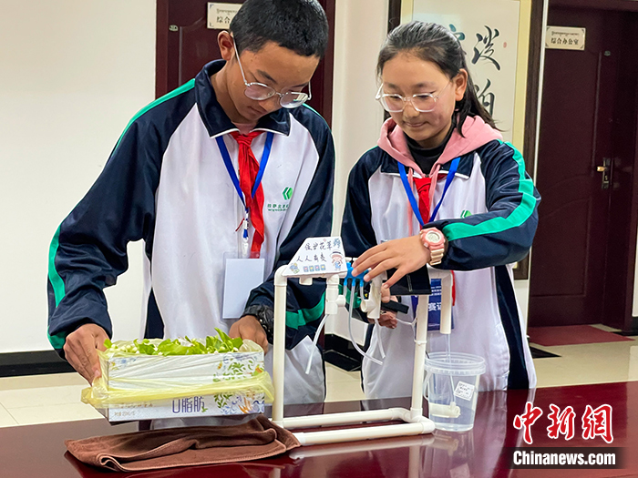 圖為智慧社區(qū)中學(xué)組參賽選手向評(píng)委老師展示作品《太陽能自動(dòng)澆灌系統(tǒng)》的工作原理。 中新社記者 趙朗 攝