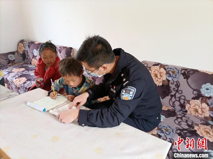 圖為民警為扎西江措(左二)輔導作業(yè)。旺旦次仁 攝