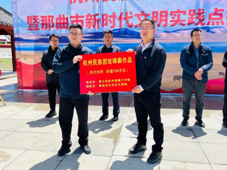 儀式上,那曲市委宣傳部決定將杭州民族團(tuán)結(jié)碑廊設(shè)為那曲市新時代文明實踐點,并進(jìn)行授牌。杭州援藏工作組向色尼區(qū)捐贈價值700萬元的杭州民族團(tuán)結(jié)碑廊書法作品。
