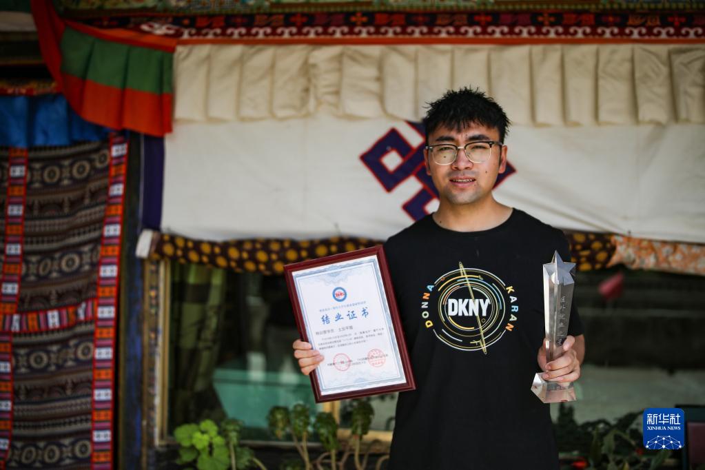 “格?;ㄩ_”大學(xué)生就業(yè)創(chuàng)業(yè)特訓(xùn)營學(xué)員、江蘇今世緣酒業(yè)股份有限公司甘青藏大區(qū)業(yè)務(wù)經(jīng)理土旦平措展示特訓(xùn)營結(jié)業(yè)證書和“區(qū)外就業(yè)之星”獎杯(2022年6月23日攝)。新華社記者 姜帆 攝
