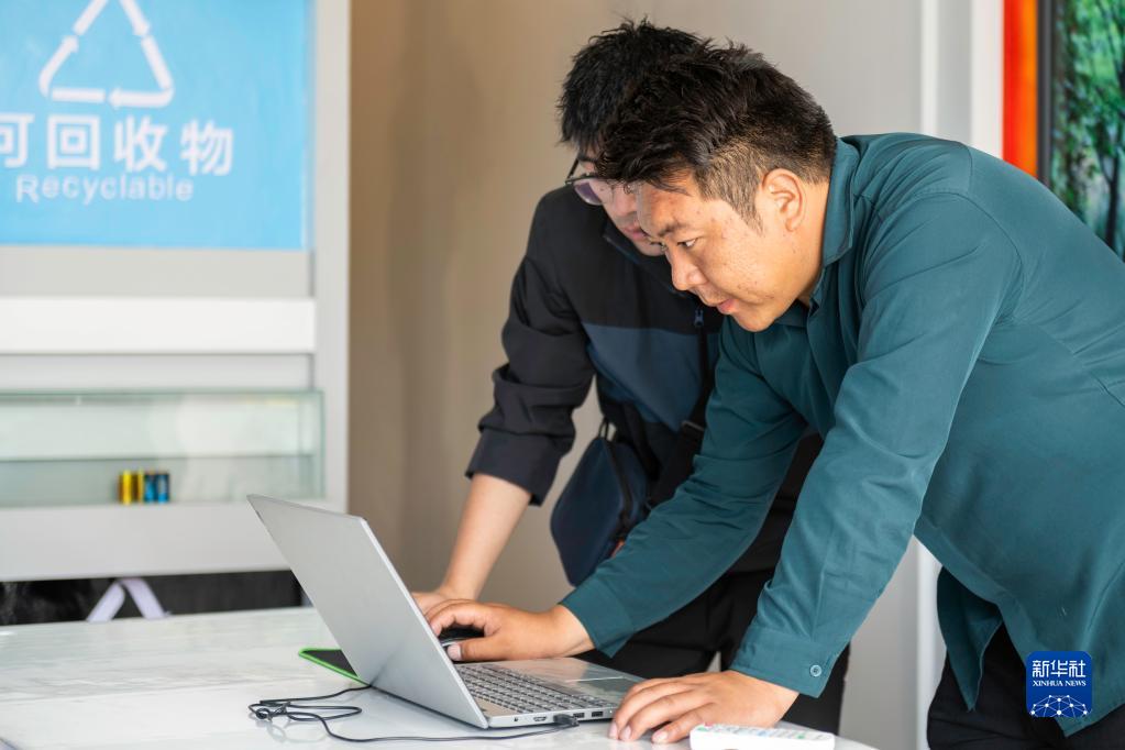 “格?;ㄩ_”大學(xué)生就業(yè)創(chuàng)業(yè)特訓(xùn)營學(xué)員、西藏墨竹工卡格?;ㄩ_大學(xué)生創(chuàng)業(yè)管理有限公司創(chuàng)辦人頓珠次仁(右)在墨竹工卡縣生活垃圾分類宣教中心講解垃圾分類常識(2022年6月23日攝)。新華社記者 周荻瀟 攝