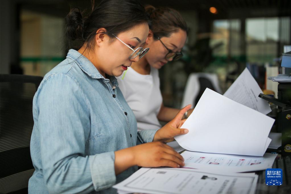 “格?;ㄩ_”大學(xué)生就業(yè)創(chuàng)業(yè)特訓(xùn)營學(xué)員、西藏藏建科技股份有限公司職員次仁瓊達(左)在工作(2022年6月24日攝)。新華社記者 姜帆 攝