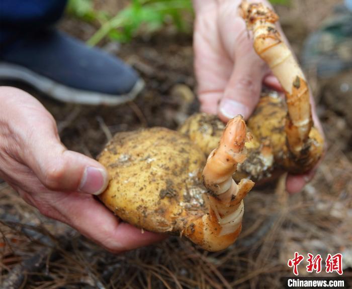 圖為工作人員展示藏天麻種植基地?fù)嵊奶炻??!∪轿木?攝
