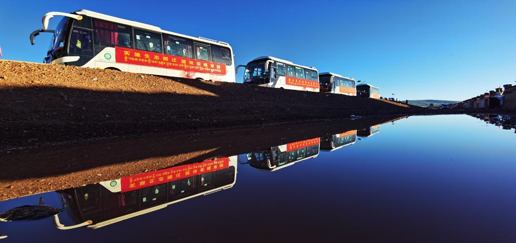 翻過高高的山梁,繞過藍藍的湖泊,一輛輛大巴首尾相連,行駛在蜿蜒的高原公路上。