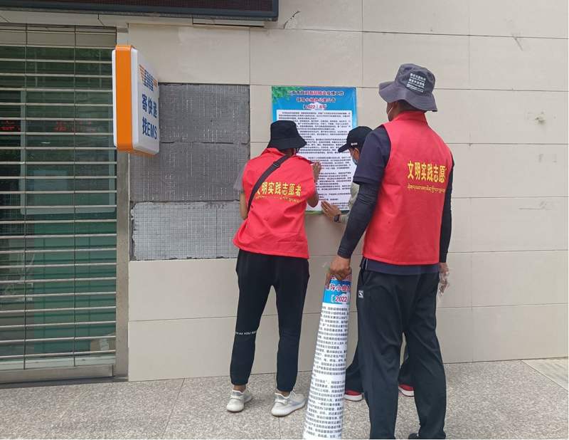 山南市新時(shí)代文明實(shí)踐志愿者們張貼宣傳單。圖片由貢嘎縣新時(shí)代文明實(shí)踐中心提供