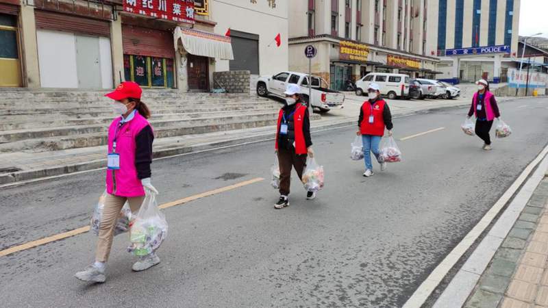 洛隆縣孜托鎮(zhèn)德康社區(qū)新時(shí)代文明實(shí)踐志愿者為社區(qū)居家隔離人員配送物資。圖片由昌都市文明辦提供
