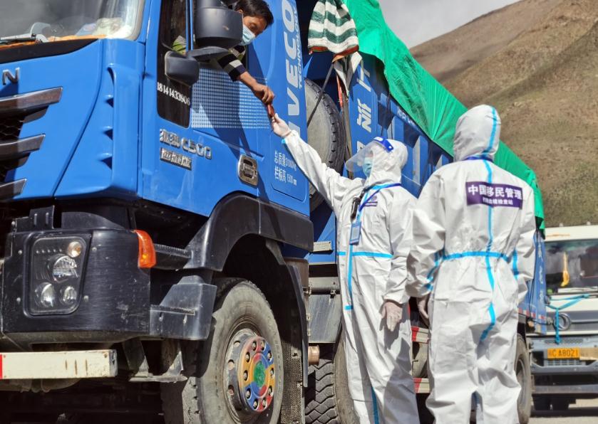 圖為西藏山南邊境管理支隊機(jī)關(guān)“黨員先鋒隊”移民管理警察在查驗人員核酸檢測報告。徐道超 攝