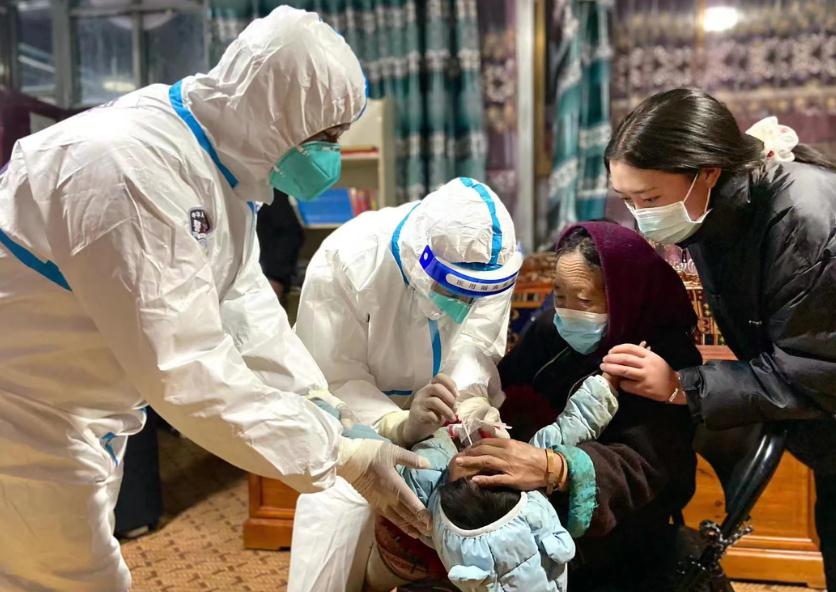 圖為西藏山南邊境管理支隊普瑪江塘邊境派出所移民管理警察協(xié)助醫(yī)務(wù)人員為轄區(qū)群眾進(jìn)行核酸檢測。涂奇源 攝