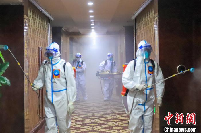 西藏森林消防隊(duì)員對(duì)隔離酒店進(jìn)行覆蓋式消殺?!∥鞑厣窒揽傟?duì) 供圖