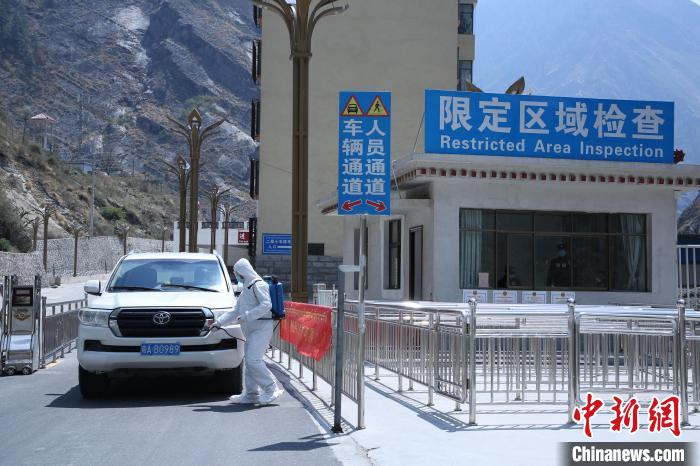吉隆出入境邊防檢查站移民管理警察對(duì)外出口岸限定區(qū)域車輛進(jìn)行消毒?!⌒じ毁F 攝