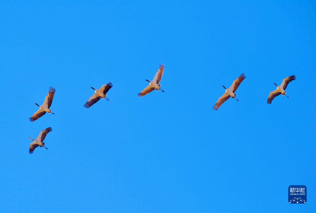 黑頸鶴在林周縣黑頸鶴自然保護(hù)區(qū)上空盤旋(11月6日攝)。新華社記者 張汝鋒 攝