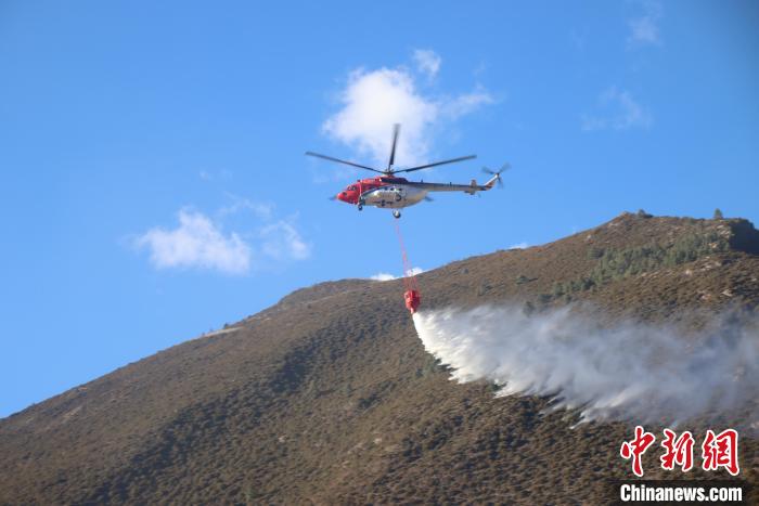直升機(jī)開展吊桶灑水作業(yè)。 西繞拉翁 攝