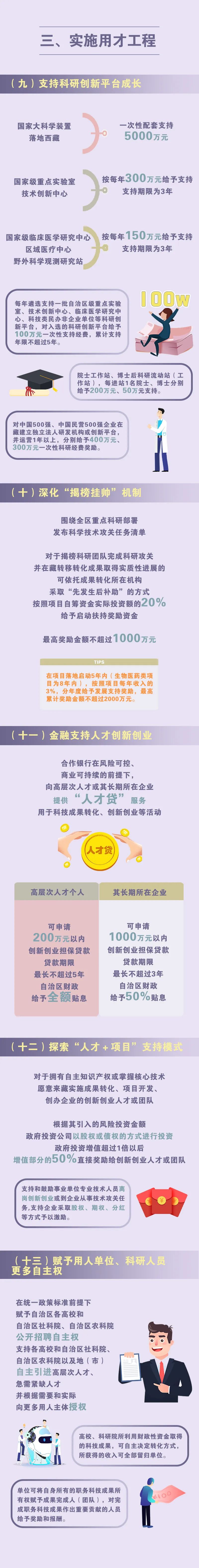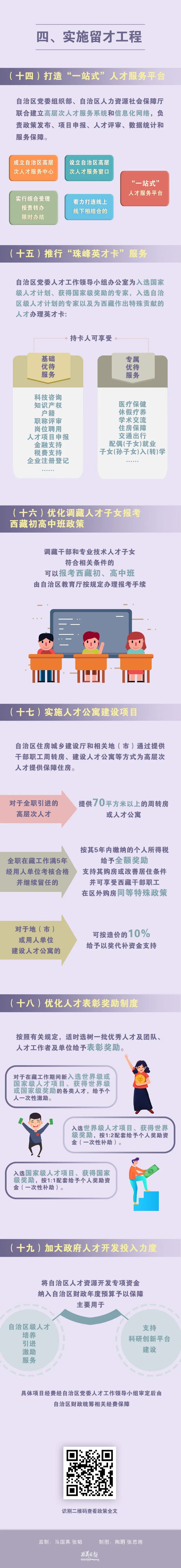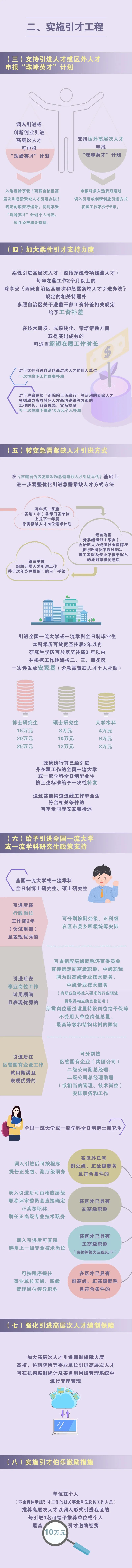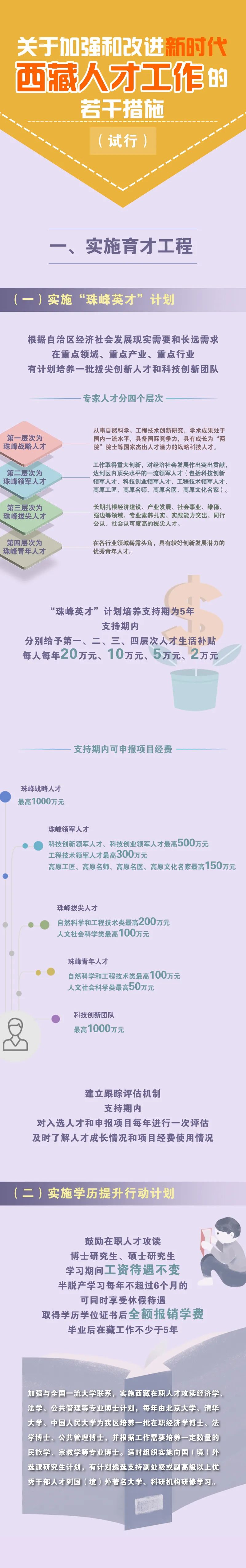 實(shí)施“珠峰英才”計(jì)劃,每年遴選支持一批珠峰戰(zhàn)略人才、珠峰領(lǐng)軍人才、珠峰拔尖人才、珠峰青年人才和科技創(chuàng)新團(tuán)隊(duì),在5年支持期內(nèi)給予生活補(bǔ)貼和項(xiàng)目經(jīng)費(fèi)支持,項(xiàng)目經(jīng)費(fèi)最高可申請(qǐng)1000萬元。實(shí)施學(xué)歷提升行動(dòng),支持在職人才攻讀研究生,并協(xié)調(diào)全國頂尖高校為西藏定向培養(yǎng)博士研究生。