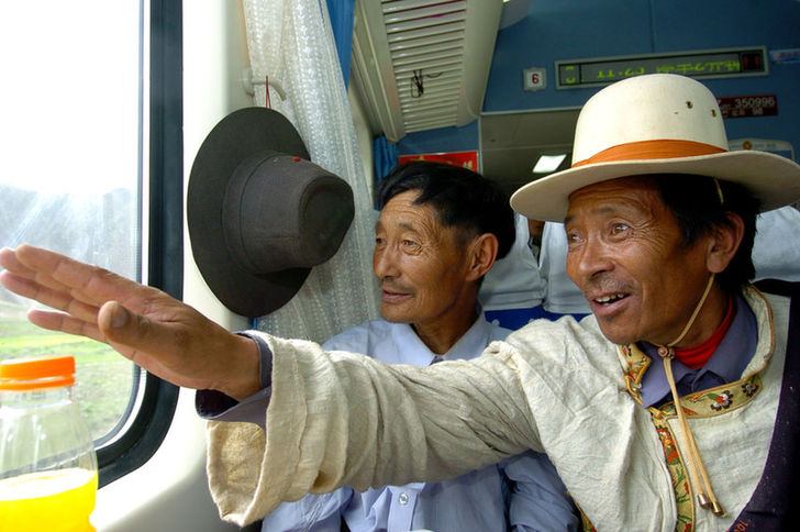 2006年7月1日,乘坐“藏2”次列車的藏族牧民(右)在欣賞窗外的美景。