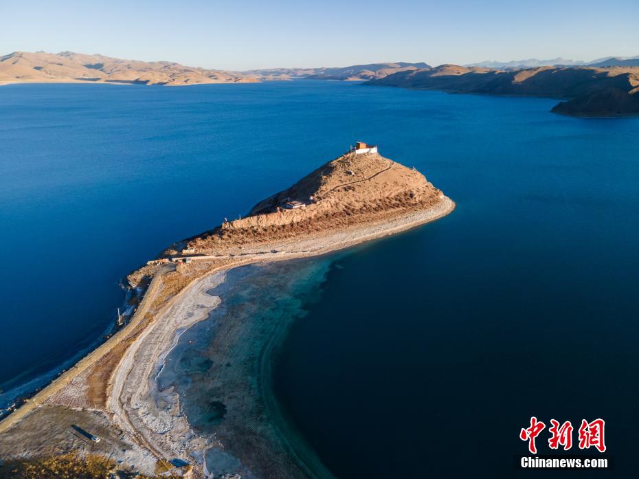 近日,西藏自治區(qū)山南市羊卓雍錯(cuò)(簡(jiǎn)稱羊湖),冬日由于沒有云層遮擋,湖水更顯深藍(lán)、孔雀藍(lán)。航拍視角下,湖水像巨大的寶石鑲嵌于高原大地,風(fēng)光壯麗。羊卓雍錯(cuò)藏語意為“碧玉湖”,湖面海拔4441米,與納木錯(cuò)、瑪旁雍錯(cuò)并稱西藏三大“圣湖”。圖為羊湖著名景點(diǎn)日托寺。 江飛波 攝