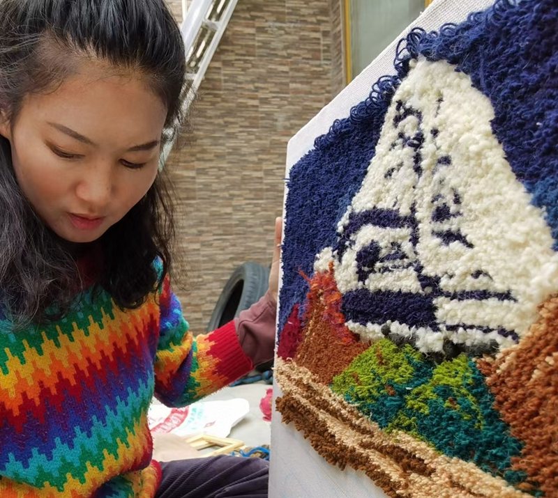 不過,起初也遇到了不少困難和挑戰(zhàn)?!鞍⒓褌儯ú卣Z:對年長女性的尊稱)的編織手藝都很棒,但她們幾乎沒上過學(xué),拘泥于傳統(tǒng)思維,創(chuàng)新力不足,做出來的產(chǎn)品花樣陳舊,一直打不開市場。而且她們對很多新鮮事物的接受度低,不愿意改變。比如她們只做色彩鮮艷的氆氌(藏族人民手工生產(chǎn)的一種毛織品,可做衣服、床毯等)。我想打破慣常思維,做一些時髦的產(chǎn)品出來?!贝稳是浠貞?。