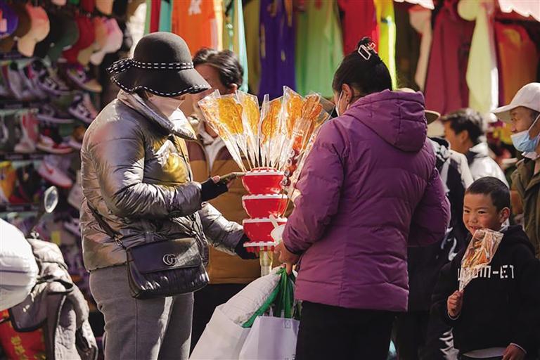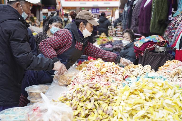 “市場(chǎng)現(xiàn)有1200多家商戶,經(jīng)營(yíng)商品有零食、蔬菜、肉類、干雜、五金、服裝等。藏歷新年臨近,每天前來置辦年貨的市民絡(luò)繹不絕,日均人流量超1萬。為保證藏歷新年期間年貨充足,市場(chǎng)商戶們提前籌備、積極備貨,目前,各類商品庫(kù)存充足、品種豐富,基本上能夠滿足不同消費(fèi)者的需求。”沖賽康商貿(mào)有限公司負(fù)責(zé)人尼瑪告訴記者。此外,沖賽康市場(chǎng)將于2月19日至27日暫停營(yíng)業(yè),28日起正常營(yíng)業(yè)。