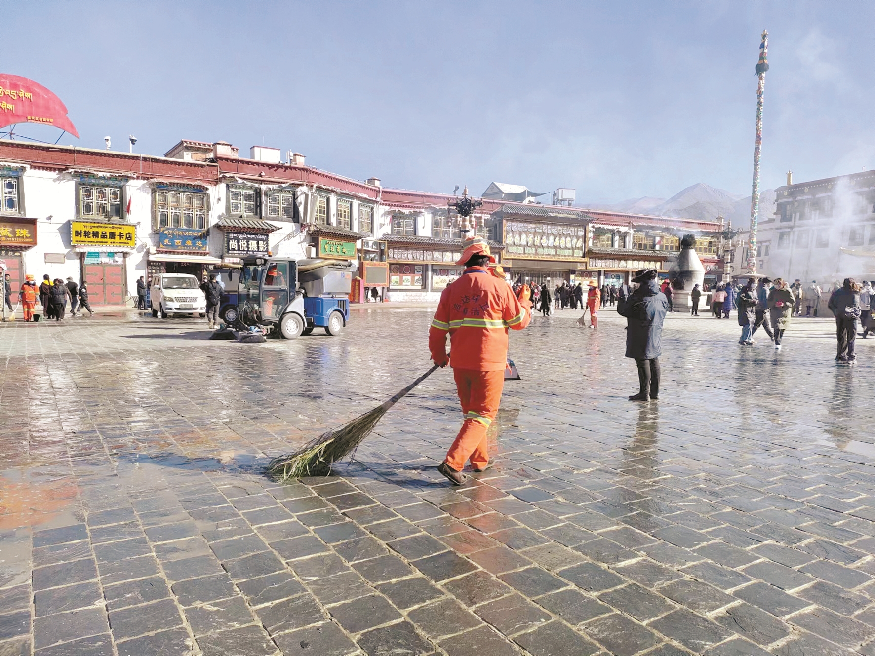 “今天,針對大昭寺廣場衛(wèi)生整治,我們一共出動了20余名保潔人員,還有一臺小高壓沖洗車和兩臺小型機掃車。通過人機結(jié)合的方式,對廣場進行徹底的衛(wèi)生大掃除,希望在藏歷新年期間,為市民營造一個良好的衛(wèi)生環(huán)境?!蔽鞑夭┤瓠h(huán)衛(wèi)服務有限公司督察員強巴偉色介紹說。