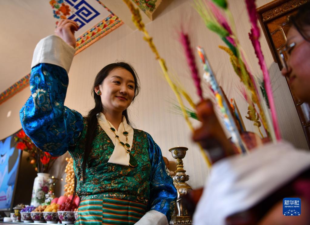 2月21日,在西藏拉薩,身著藏裝的姑娘在吃寓意五谷豐登的“切瑪”。新華社記者 晉美多吉 攝