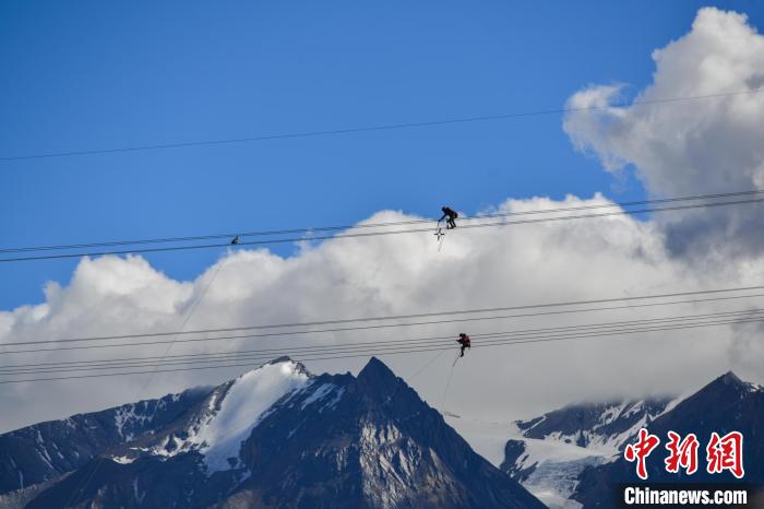 資料圖為2020年6月23日,西藏阿里聯(lián)網(wǎng)工程施工人員在日喀則希夏邦馬雪山附近走線作業(yè)。江飛波 攝