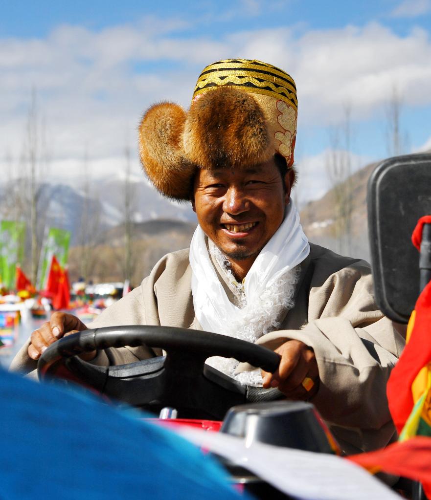 56歲的扎西次仁頭戴圓筒帽,身穿白色氆氌,腳蹬黑色靴子,開著五彩哈達和鮮花裝束的拖拉機來到開耕現場?!皩r民來說,春耕秋收是一年中最重要的事情,每個人都要盛裝打扮出席。”他說。