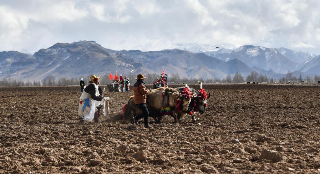 春耕儀式上,古老的“二牛抬杠”耕作方式已經成為僅具象征意義的儀式(3月16日攝)。新華社記者 晉美多吉 攝