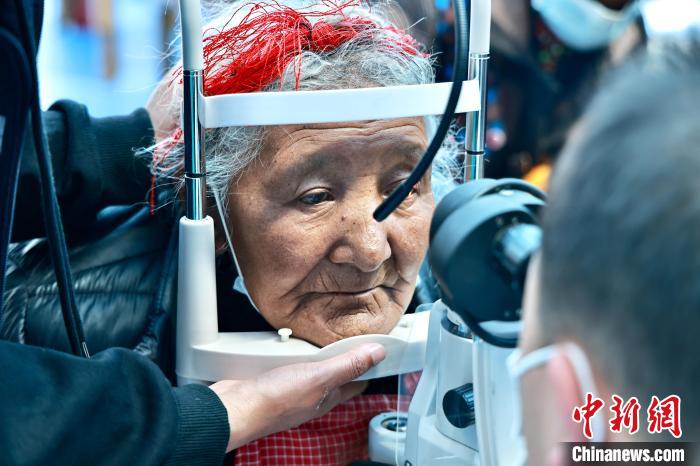 圖為專業(yè)眼科醫(yī)生為老人檢測視力?!「裆?攝