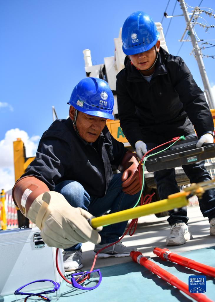 4月26日,扎西尼瑪(左)在進(jìn)行絕緣電阻檢測(cè)。新華社記者 劉洲鵬 攝
