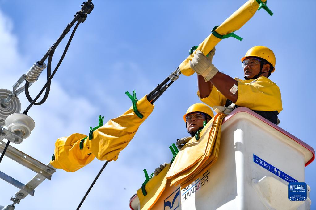 4月26日,扎西尼瑪(右)和徒弟在進(jìn)行高空帶電作業(yè)演練。新華社記者 晉美多吉 攝