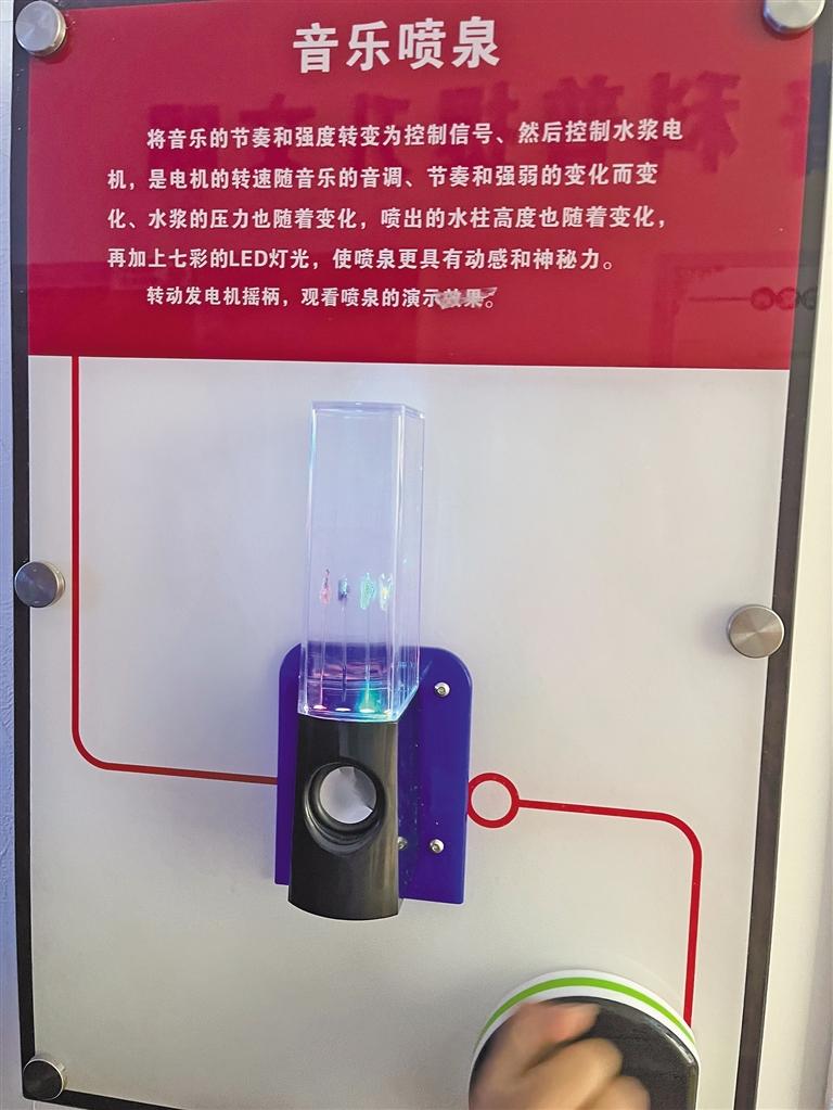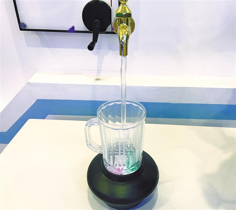 “這個(gè)體驗(yàn)項(xiàng)目叫‘天上來水’。設(shè)計(jì)者巧妙設(shè)計(jì)水流通過水泵及透明玻璃管壓入水龍頭內(nèi),在封閉的水龍頭出口處將水溢出管口,溢出的水又將玻璃管隱蔽,水流的循環(huán)造成觀眾難以發(fā)現(xiàn)特殊裝置的奧秘,從而形成人為制造的錯(cuò)覺。”體驗(yàn)結(jié)束后,索央向小朋友解釋“天上來水”的科學(xué)原理。